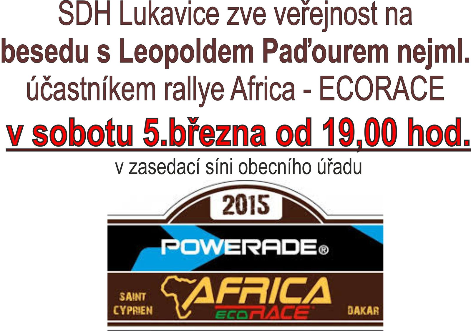 SDH Lukavice zve veřejnost na besedu s Leopoldem Paďourem nejml. účastníkem rallye Africa - ECORACE. Beseda se koná v sobotu 5. března 2016 od 19,00 hod. v zasedací síni obecního úřadu.