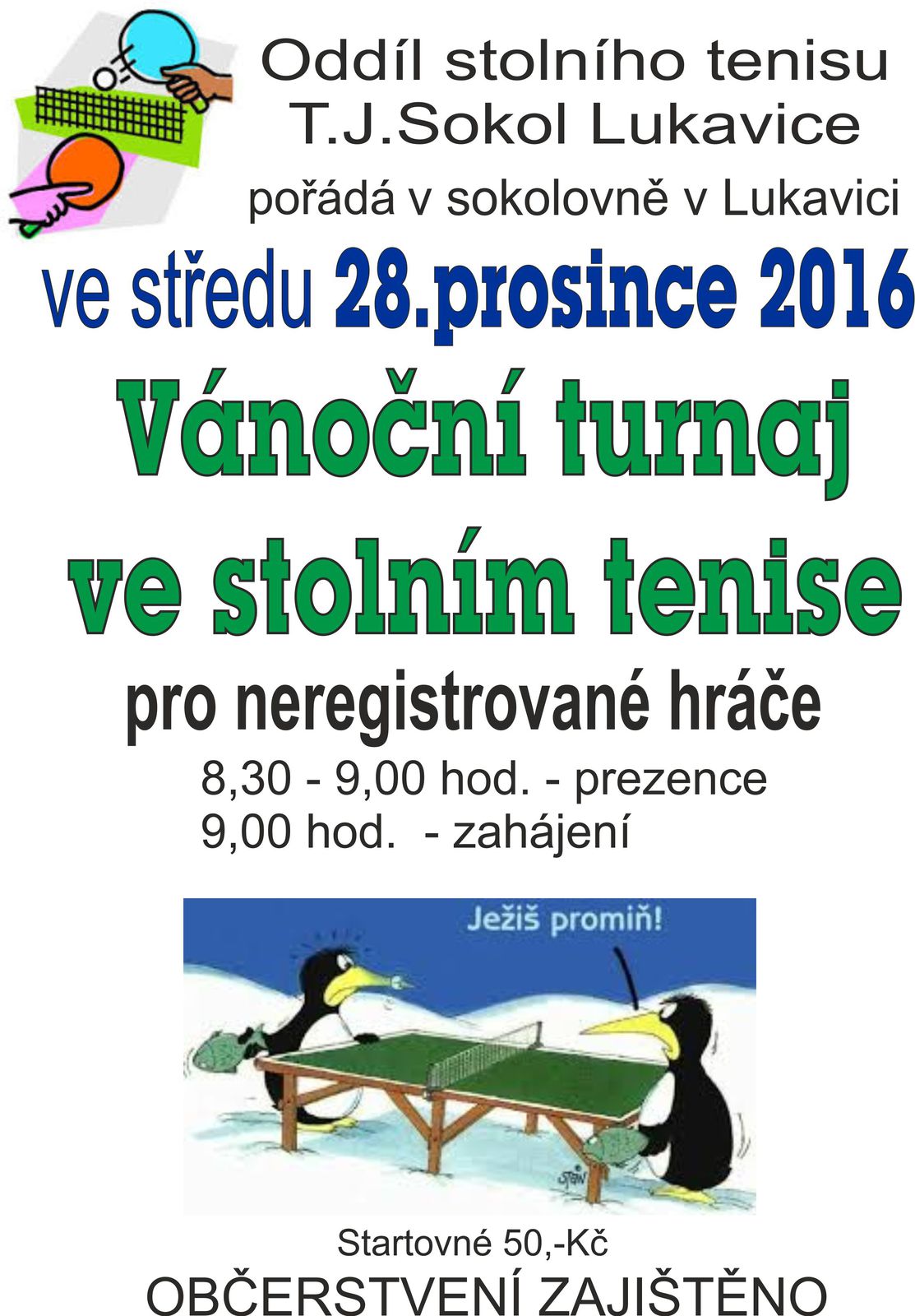 Oddíl stolního tenisu T.J. Sokol Lukavice pořádá Vánoční turnaj ve stolním tenise pro neregistrované hráče. Turnaj se koná ve středu 28. prosince 2016. Od 8,30 do 9,00 hod. proběhne prezence, začíná se v 9,00 hod.. Startovné je 50 Kč. Občerstvení zajištěno.