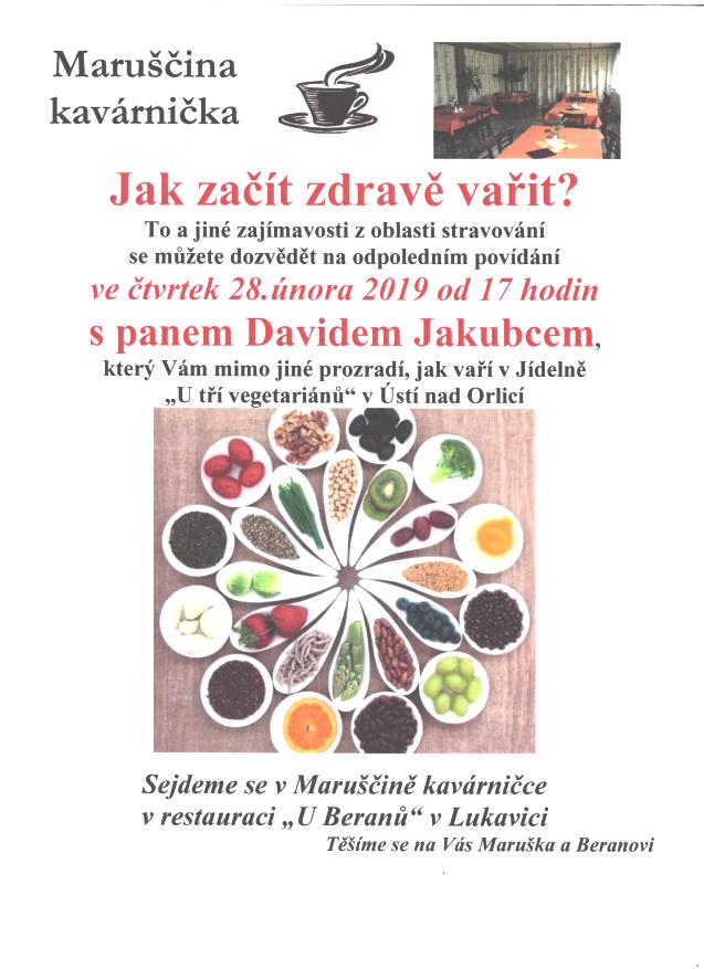 Ve čtvrtek 28.února 2019 v 17 hod. se v Maruščině kavárničce v restauraci U Beranů dozvíte jak začít správně vařit. To a jiné zajímavosti z oblasti stravování se dozvíte od pana Davida Jakubce, který mimo jiné prozradí, jak vaří v Jídelně "U tří vegetariánů" v Ústí nad Orlicí.