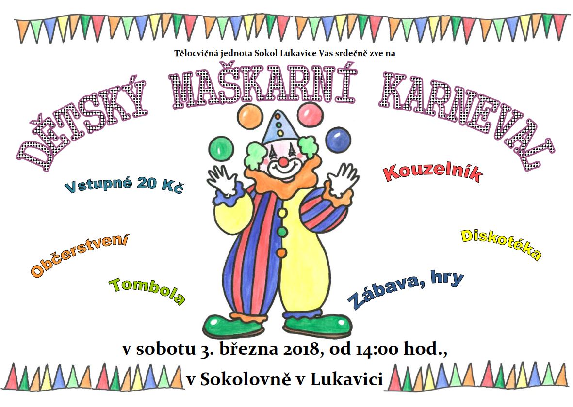 T.J. Sokol Lukavice Vás srdečně zve na Dětský maškarní karneval, který se koná v sobotu 3. března 2018 od 14:00 hodin v Sokolovně. Můžete se těšit na odpoledne plné her, zábavy, tance, tombolu i návštěvu kouzelníka.