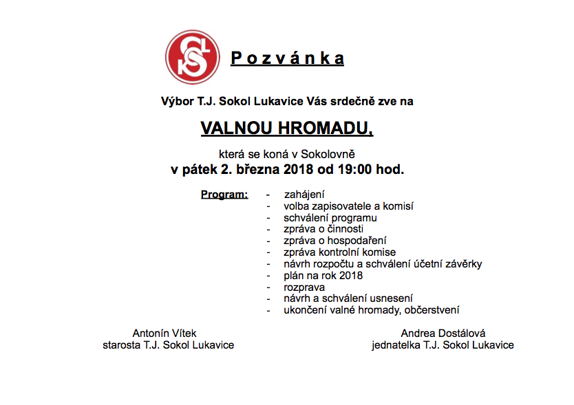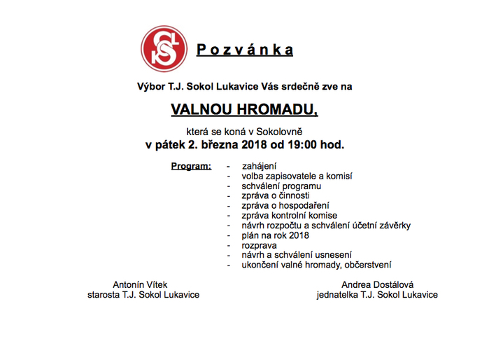 V pátek 2. března se od 19:00 hodin v Sokolovně koná Valná hromada T.J. Sokol Lukavice. Srdečně zveme naše členy i příznivce.