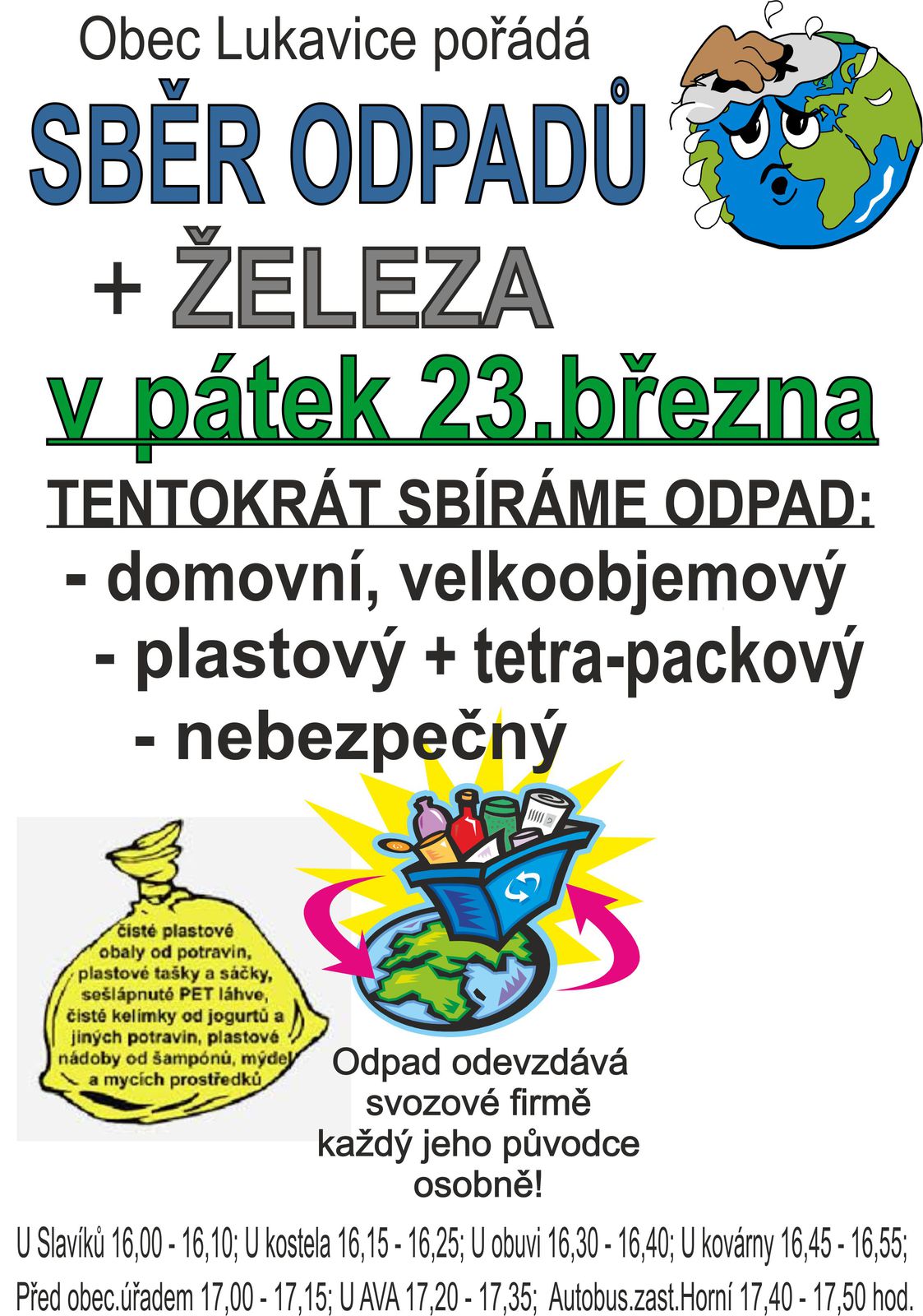 V pátek 23. března 2018 proběhne sběr odpadů a zároveň sběr železa. Začátek sběru je v 16 hod. a dále dle rozpisu na obvyklých stanovištích.