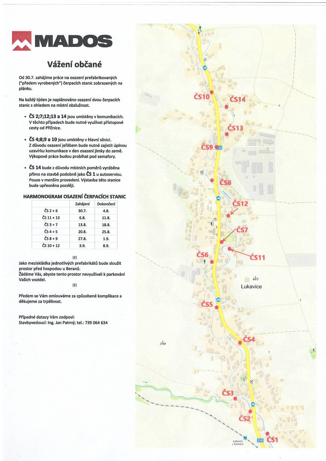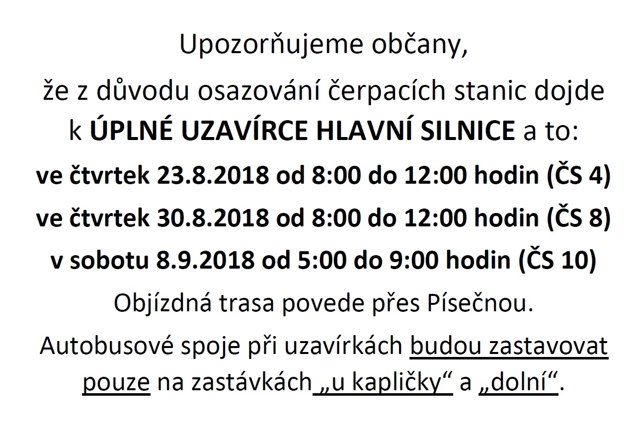 Firma MADOS oznamuje v přiloženém plánku termíny osazování čerpacích stanic. Ve většině případů dojde k úplné uzavírce příslušné místní komunikace nebo silnice II/310. Objížďka bude vedena přes Písečnou. Věnujte prosím pozornost textu přiloženého letáku. Děkujeme.
