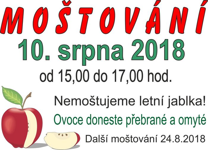 V pátek 10. srpna 2018 zahajují zahrádkáři moštování. Moštovat se bude od 15 do 17 hodin. Nenoste letní jablka, pro moštování nejsou vhodná. Ovoce doneste přebrané a omyté. Další moštování bude 24.srpna.