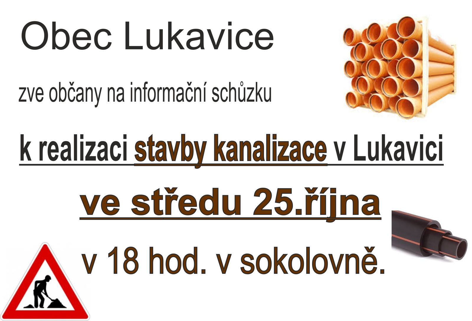 Obec Lukavice Vás zve na informační schůzku ke stavbě kanalizace, která se bude konat ve středu 25.října 2017 od 18 hod. v sokolovně.