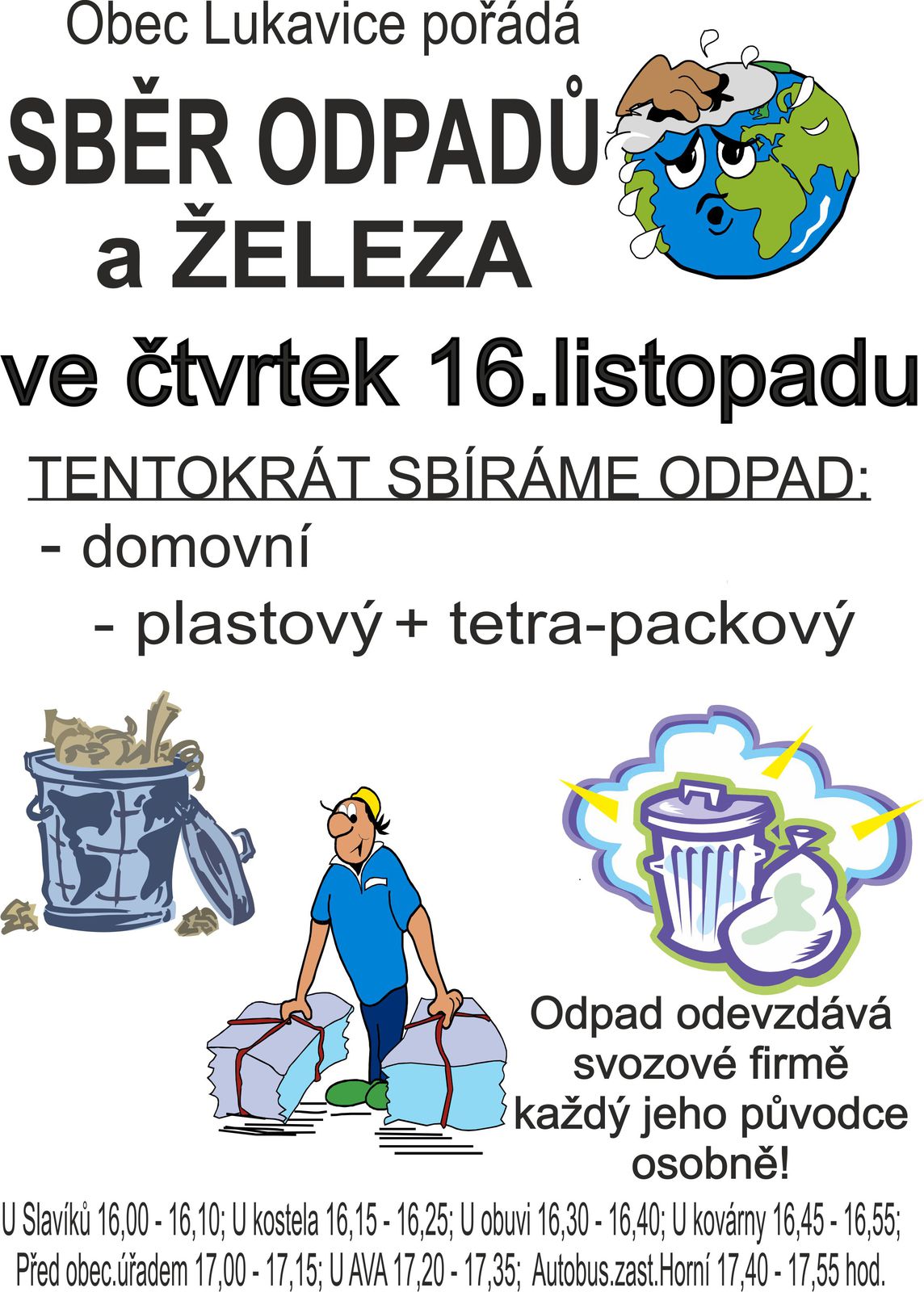Ve čtvrtek 16.listopadu proběhne poslední letošní sběr odpadů. Začátek sběru je v 16 hodin a dále dle rozpisu na obvyklých stanovištích.