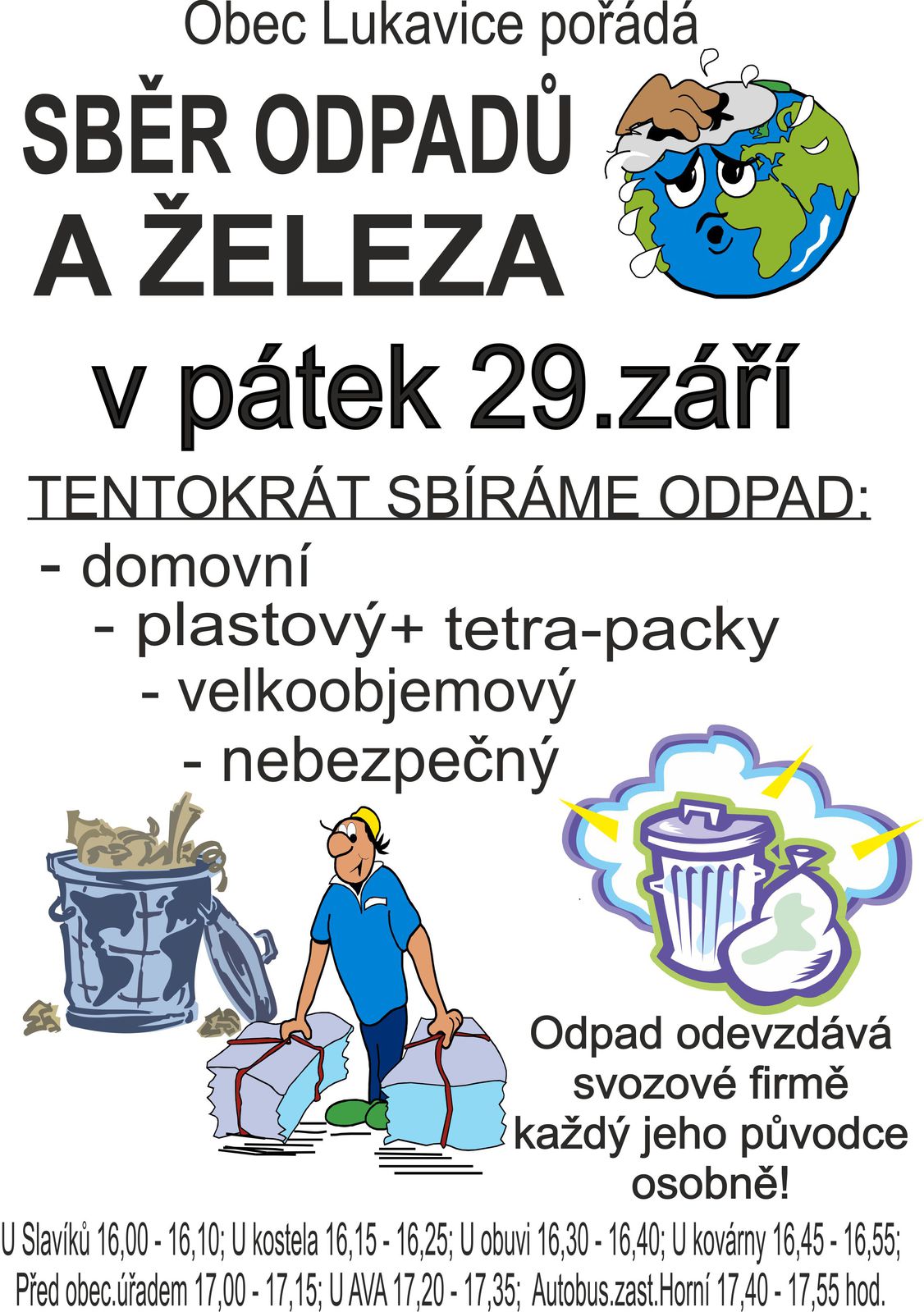 V pátek 29.září proběhne sběr odpadů a sběr železa. Začátek sběru je v 16 hodin a dále dle rozpisu na obvyklých stanovištích.