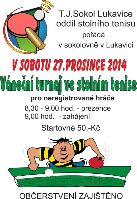 T. J. Sokol Lukavice, oddíl stolního tenisu pořádá pro neregistrované hráče Vánoční turnaj ve stolním tenise. Turnaj se koná v sobotu 27. prosince 2014 od 9,00 hod. Startovné činí 50 Kč. Občerstvení je zajištěno.