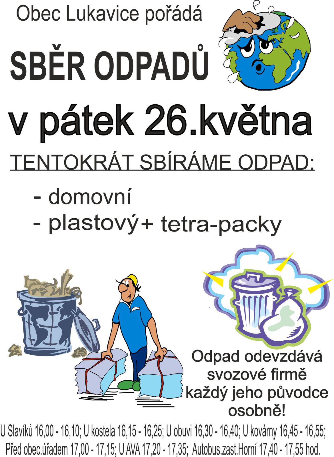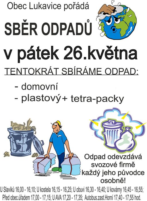 V pátek 26.května 2017 pořádá Obec Lukavice pravidelný sběr odpadů. Sbírat se bude odpad domovní, plastový a tetra -packy. Začtek sběru je v 16 hodin a dále dle rozpisu na jednotlivých stanovištích.