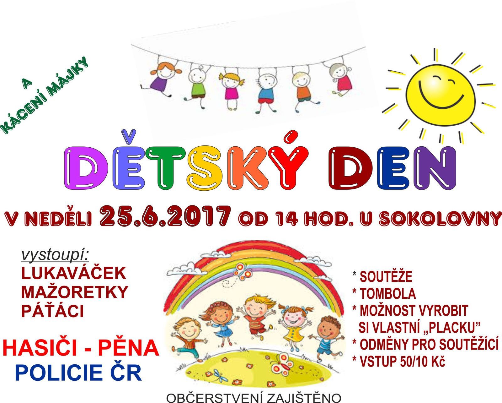 SRPŠ společně se ZŠ a MŠ Lukavice pořádají tradiční Dětský den, který se koná v neděli 25. června 2017 od 14,00 hod. na hřišti u sokolovny. V programu vystoupí Lukaváček, mažoretky, zatančí i páťáci. Připraveny budou soutěže, tombola i odměny pro soutěžící. Děti si budou moci vyrobit vlastní "placku" a když všechno dobře půjde a nebudou mít hlášený výjezd, tak přijedou Policie ČR a hasiči i s pěnou. Na závěr akce se bude kácet májka. Občerstvení bude zajištěno. Vstupné - herní kartička 50 Kč, ostatní 10 Kč.