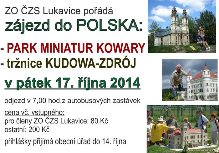 ZO ČZS Lukavice pořádá v pátek 17. října zájezd do Polska. Pojede se do Parku miniatur v Kowarech a na tržnici do Kudowy-Zdrój. Odjezd je v 7,00 hod. ráno z autobusových zastávek. Cena vč. vstupného je pro členy ZO ČZS Lukavice 80 Kč a pro ostatní 200 Kč. Přihlášky přijímá obecní úřad do 14. října.