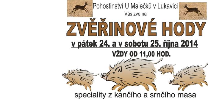 Pohostinství U Malečků Vás zve v pátek 24. a v sobotu 25. října 2014, vždy od 11 hod. na ZVĚŘINOVÉ HODY ze srnčího a kančího masa.