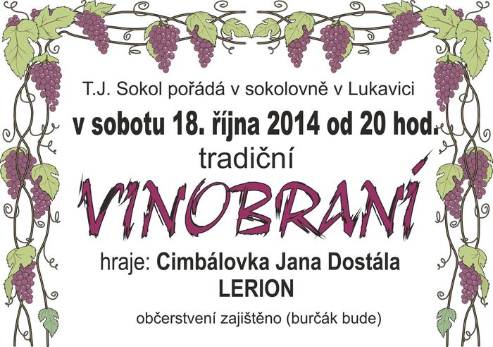 T. J. Sokol Lukavice pořádá v sobotu 18. října 2014 tradiční VINOBRANÍ. Akce se koná v sokolovně v Lukavici od 20 hod. K tanci a poslechu hrají Cimbálovka Jana Dostála a LERION. Občerstení zajištěno (burčák bude).