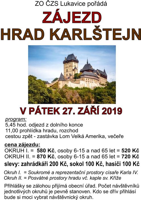 ZO ČZS pořádá v pátek 27.září 2019 zájezd na hrad Karlštejn. Program: odjezd je v 5,45 hod. z dolního konce, v 11 hod. prohlídka hradu a rozchod. Cestou zpět zastávka Lom Velká Amerika a večeře (místo bude upřesněno).