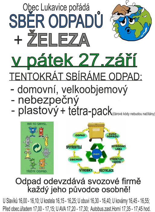 V pátek 27.září 2019 proběhne sběr odpadů a železa. Bližší informace jste obdrželi na modrém letáku. Začátek sběru je tradičně v 16 hodin a dále dle rozpisu na jednotlivých stanovištích. Pokud donesete plast nebo papír v pytli s kódem, kód nebude načten - jede jiný svozový vůz. Stále tolerujeme, že si odpad pokud ho máte více, můžete přinést na stanoviště dopředu. Potom si ho ale musíte přijít předat svozové firmě. Děkujeme za pochopení.