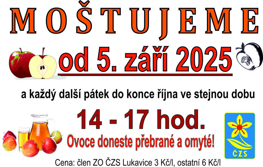 Zahrádkáři oznamují, že letošní moštování začíná v pátek 5.září 2025 od 14 do 17 hodin a bude pokračovat každý další pátek až do konce října ve stejnou dobu. Ovoce doneste přebrané a omyté. Cena za 1 litr je pro členy ZO ČZS 3 Kč a pro ostatní 6 Kč.