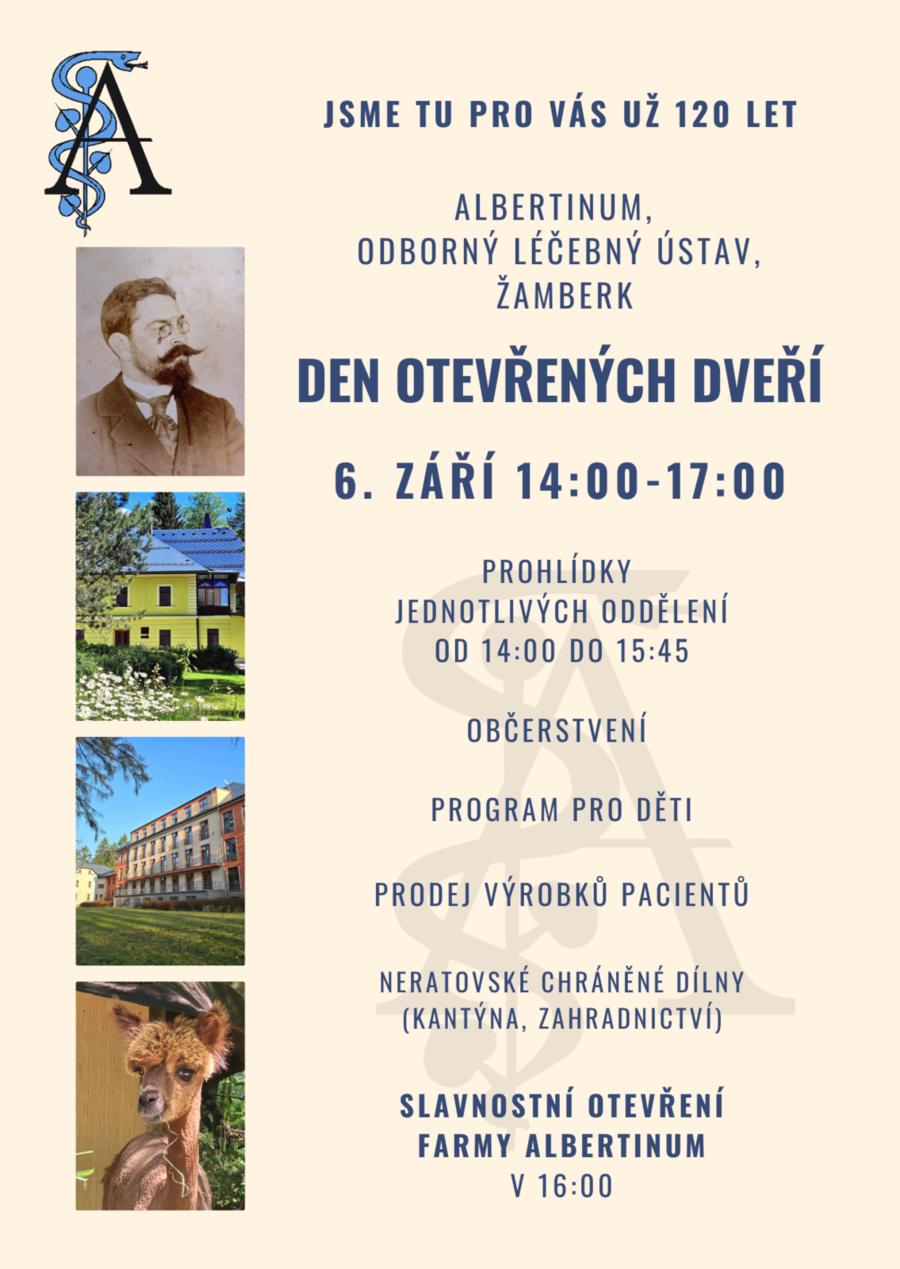 Albertinum, odborný léčebný ústav, Žamberk, Vás srdečně zve na Den otevřených dveří, který se uskuteční v sobotu 6. 9. 2025 u příležitosti 120 let založení zařízení. Další informace v letáku a na webu: www.albertinum.cz