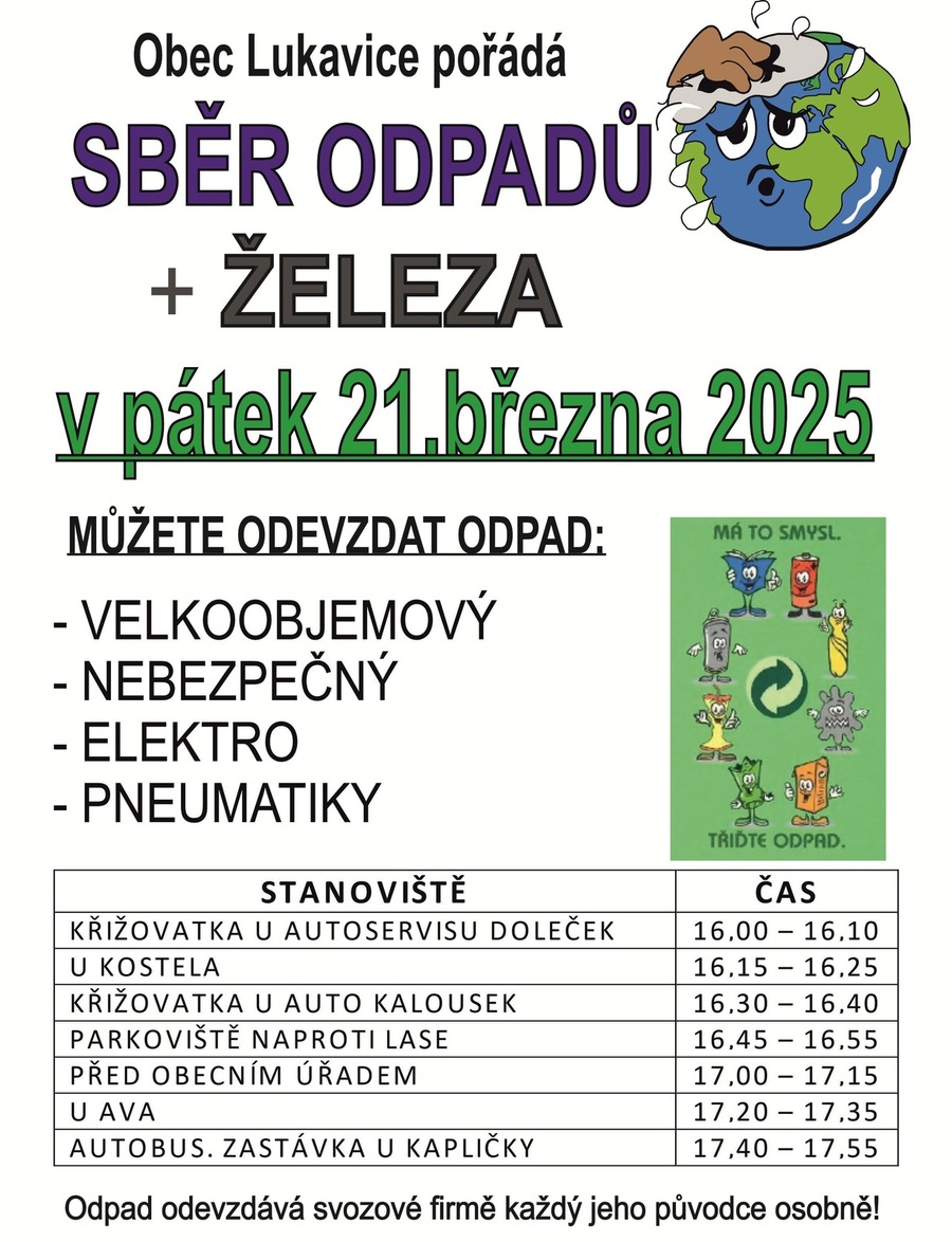 V pátek 21. března proběhne sběr odpadů a sběr železa. Začátek sběru je v 16 hodin a dále dle rozpisu na obvyklých stanovištích.