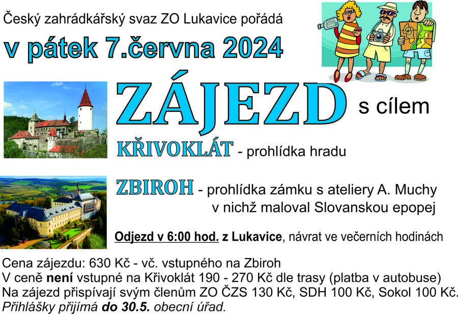Lukavští zahrádkáři pořádají v pátek 7.června 2024 zájezd s cílem Křivoklát - prohlídka hradu a Zbiroh - prohlídka zámku s ateliery A.Muchy v nichž maloval Slovanskou epopej. Cena zájezdu 630 Kč je vč. vstupného na Zbiroh. V ceně naopak není vstupné na Křivoklát 190 - 270 Kč dle vybrané trasy. Výběr trasy a její zaplacení proběhne v autobuse. Odjezd bude v 6 hod. z Lukavice, místa nástupu budou upřesněna dle aktuálního stavu opravy komunikace. Na zájezd přispívají svým členům zahrádkáři 130 Kč, hasiči a sokolové každý 100 Kč. Přihlášky přijímá obecní úřad do 30.května.