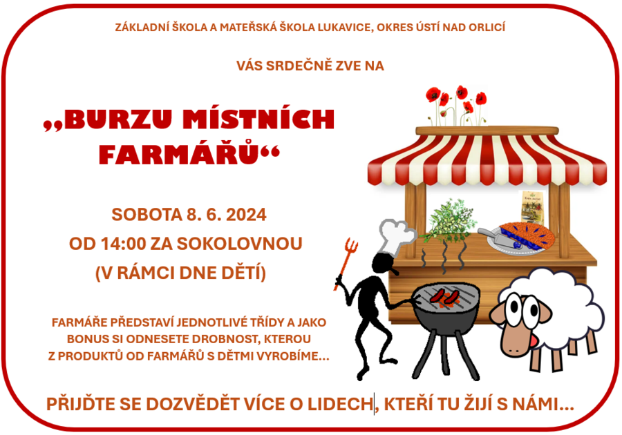 Základní škola a mateřská škola Lukavice, vás srdečně zve v sobotu 8. 6. 2024 od 14:00 hodin za sokolovnu na "BURZU MÍSTNÍCH FARMÁŘŮ".