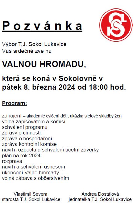 T.J. Sokol Lukavice zahajuje cvičení žen v sokolovně v pondělí 2. 9. 2024 od 19 hodin s Janou a ve středu 4. 9. 2024 od 19 hodin s Andreou.